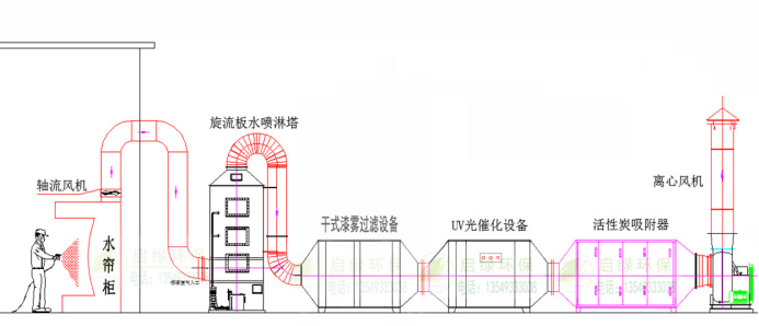 喷漆废气→水帘柜→水喷淋塔→干式过滤→UV 光解设备→活性炭吸附器→离心风机→达标排放