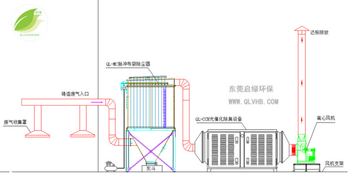 铸造废气源(浇注等工序) → 引尘罩收集 → 管道输送 → 脉冲布袋除尘器 → 光催化除臭设备 → 引风机 → 高空达标排放