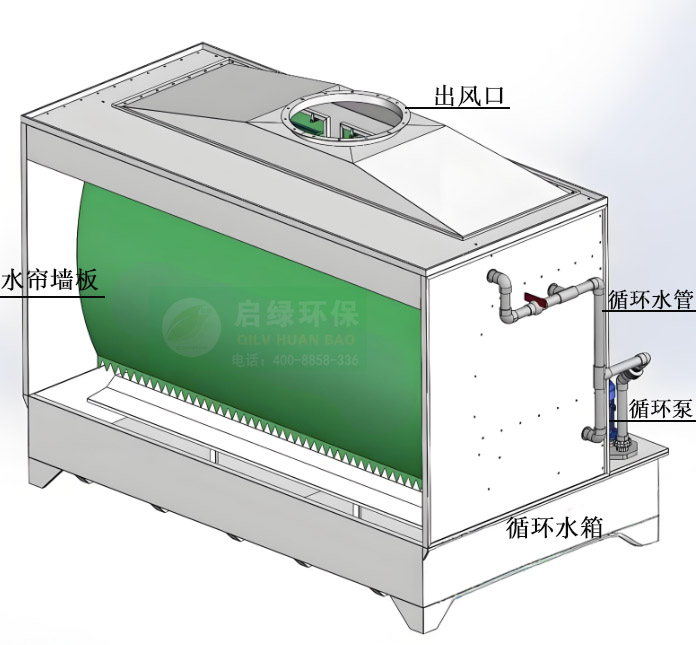 随后,经过初步离心分离的废气继续流向设备内部的水帘区域。柜体底部的水循环系统通过水泵将清水输送至顶部的水帘板,形成一层均匀、连续的水幕。当携带剩余污染物的废气穿过水幕时,废气中的有机废气分子及细小漆雾颗粒会被水幕吸附、溶解,形成含漆渣的污水流入下方的污水槽。同时,部分未被水幕完全捕捉的微小颗粒,会在柜体内部的气旋涡流作用下再次与水接触,进一步提升净化效果。最终,经过双重净化的洁净气体通过设备顶部的出风口排出,部分设备可根据需求搭配后续处理装置,确保排放完全达标。