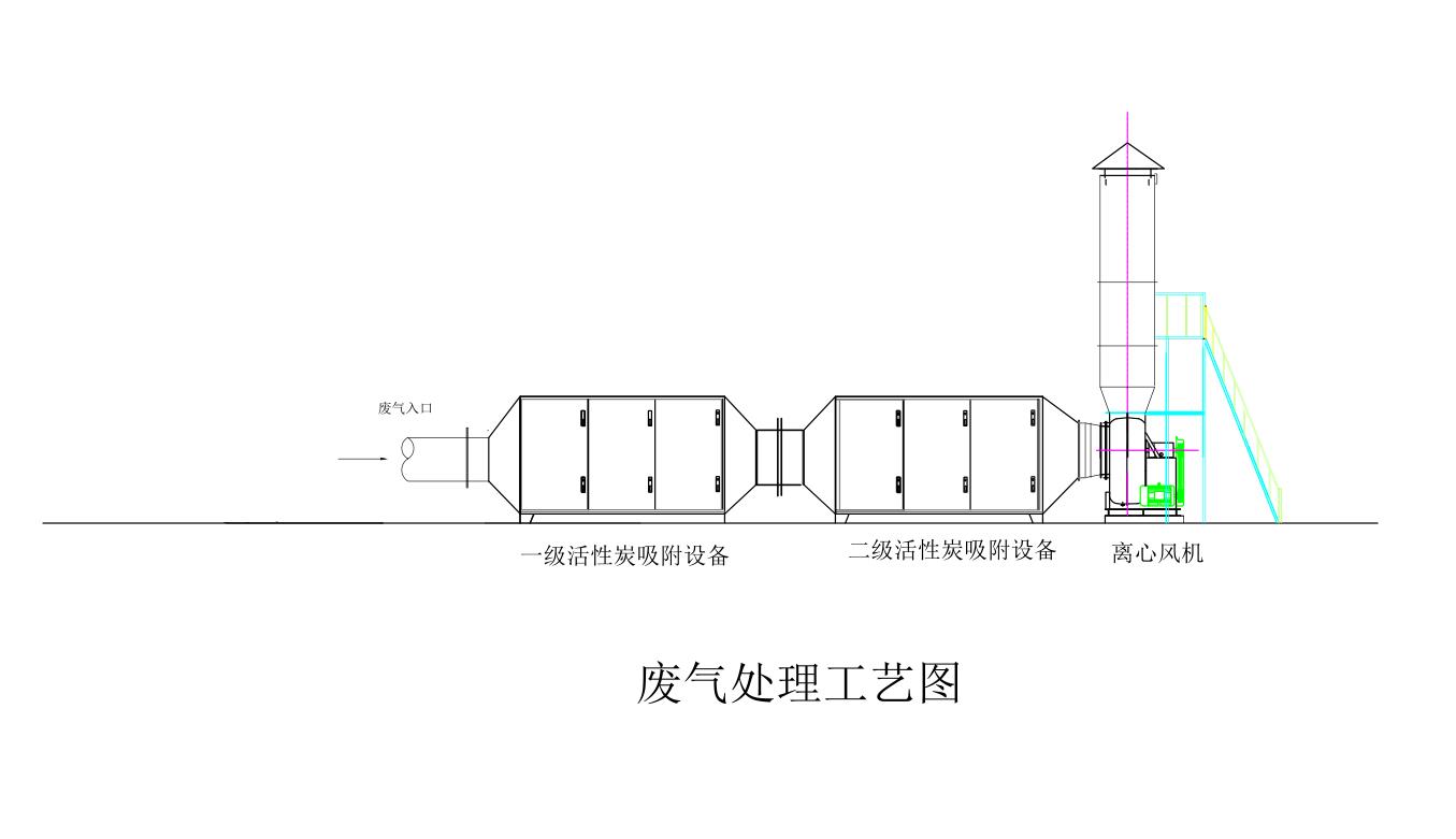 针对注塑车间 VOCs“成分复杂(含烷烃、芳烃、卤代烃等)、浓度波动大(50-500mg/m³)、湿度较高” 的特性,采用的治理工艺为:VOCs 经集气系统收集后,先通过预处理去除水汽和粉尘,再进入二级活性炭吸附设备深度净化,最终经排气筒达标排放。