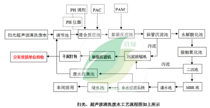 超声波清洗废水处理回用核心路径:扫光、超声波清洗废水 → 综合调节池(水质水量均衡) → 反应池(药剂投加+PH调节) → 斜管沉淀池(固液分离) → 厌氧池(水解酸化) → 好氧池(生物降解) → MBR池(膜过滤) → 清水池(中间收集) → 超滤中水回用系统(深度净化) → 车间回用储蓄桶(循环利用)